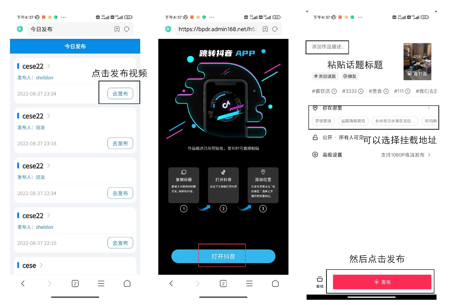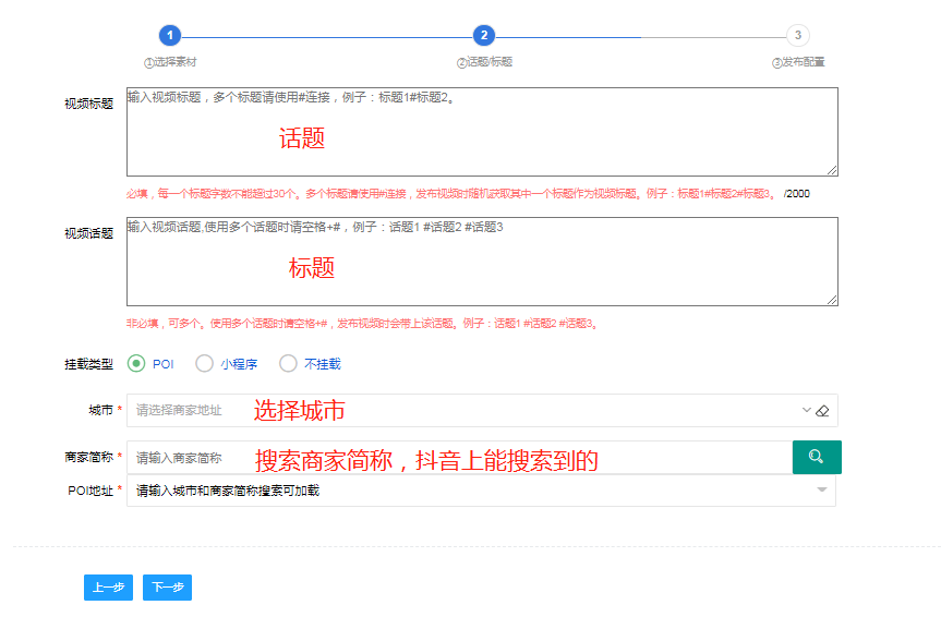 添加标题,话题,和挂载地址(话题,和poi,抖音小程序都是非必填)