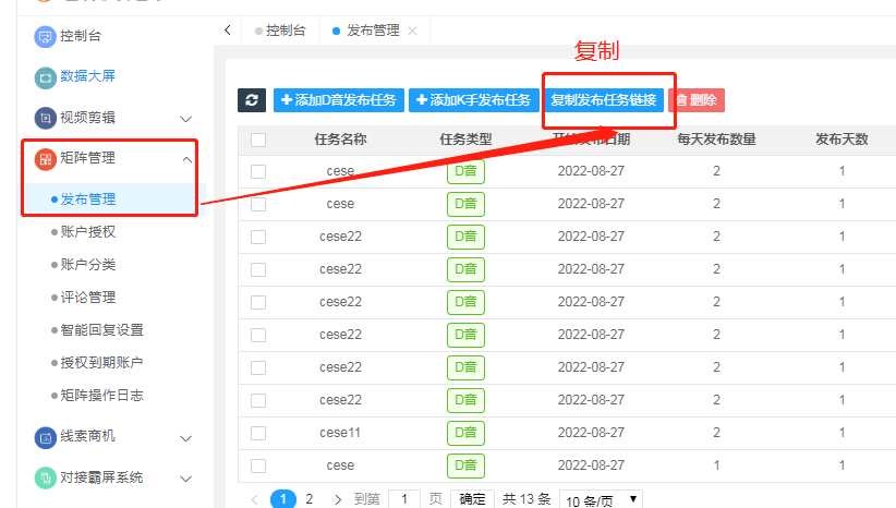 点击【矩阵管理】-【发布管理】,复制发布任务的链接