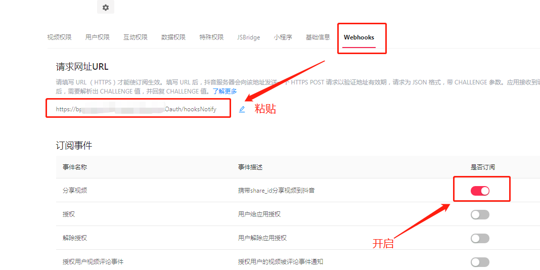 打开抖音开放平台,找到应用,点击webhooks,粘贴到url上,开启分享视频,如下图所示