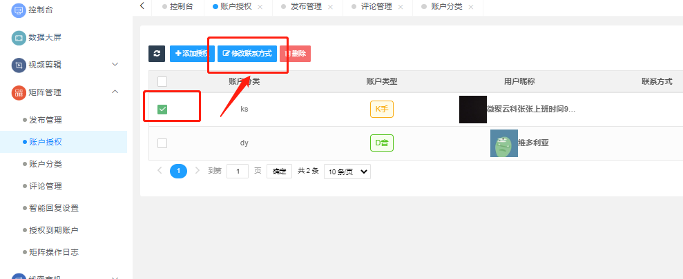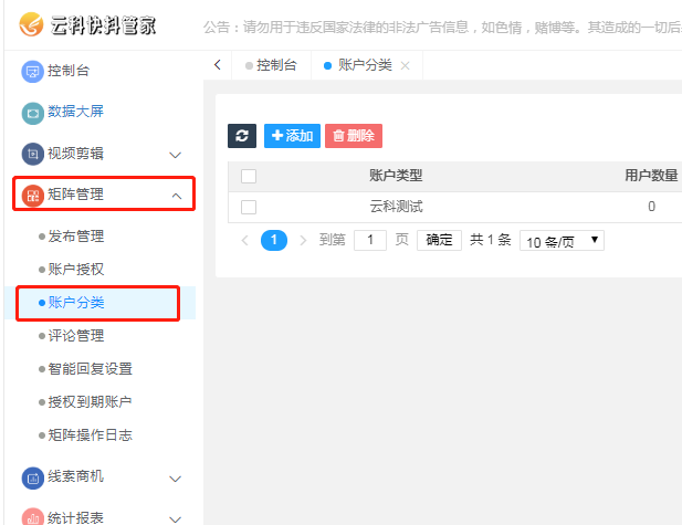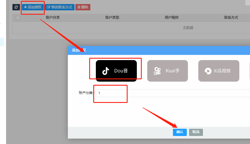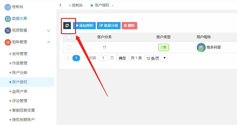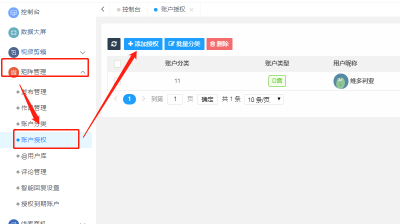 找到【矩阵管理】-【账户授权】点击【添加授权】授权个人的抖音账号。如下图所示