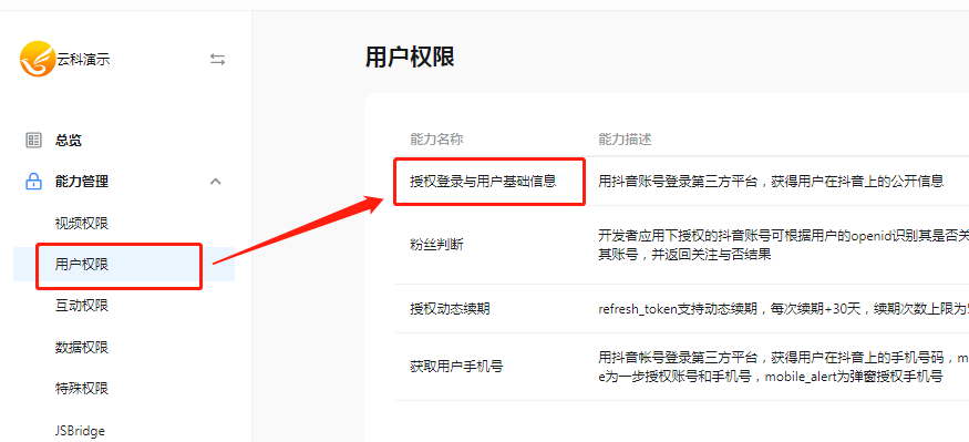 注意:如果授权不成功,登录抖音开放平台看下是否申请了这个权限,如下图所示